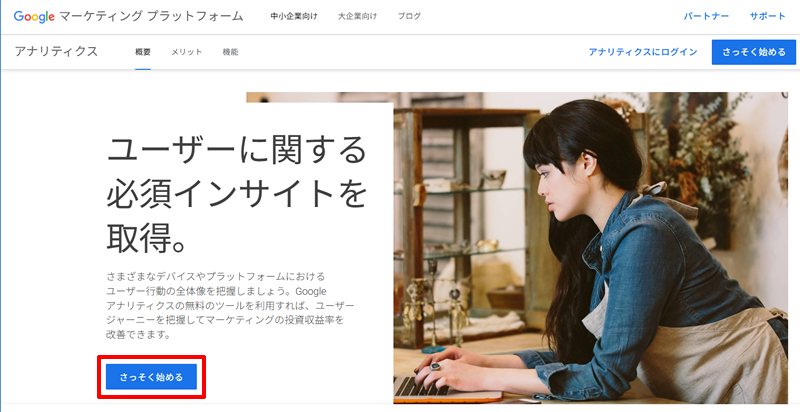 1.新しいページで、「ユーザーに関する必須インサイトを取得。」ページが開きますので、ページの中にある「さっそくはじめる」ボタンをクリックします。